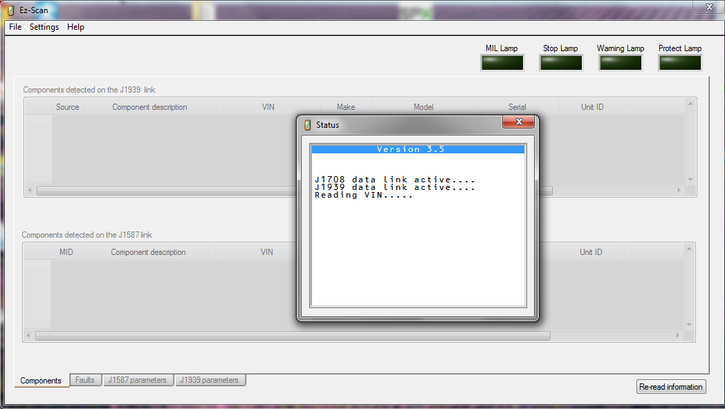 Step 1: Start the software - You will see the connecting screen appear like the image below. If you are using an Ez-TAP from XscapeEz, the software will automatically connect to the vehicle. If you are using any other RP1210 adapter, a box will appear asking you to choose your device